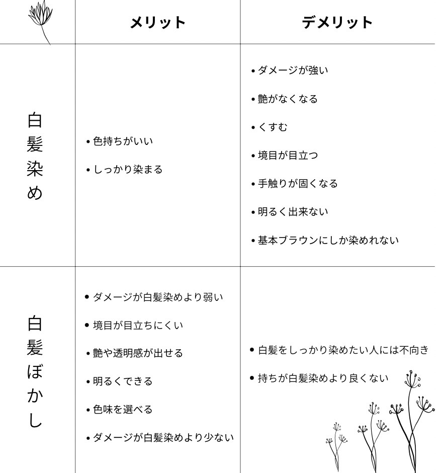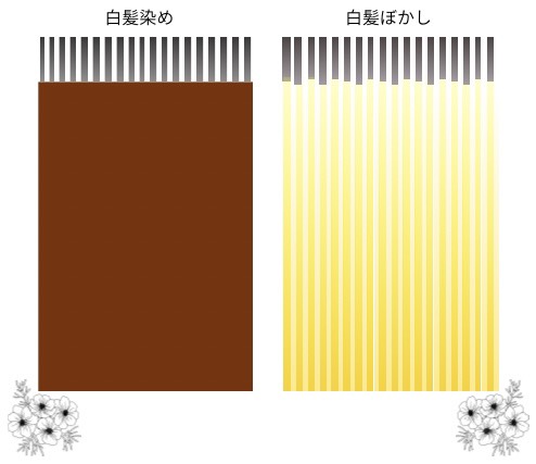 白髪染めは白髪も黒髪も茶色1色に染め持ちがいいのですが、そのせいで根元が伸びてくると、ラインが目立つようになります。白髪ぼかしは白髪も黒髪も別々の色で染めます。さらに白髪染めとは違い退色もするため、根本が伸びてきてもラインがぼけて根本が目立ちにくい特徴です。