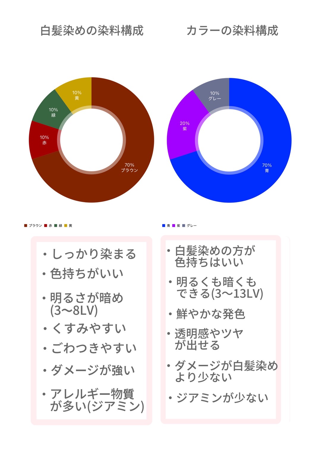 カラー材の染料は青・赤・緑など様々な色が入ってますが、白髪染めの場合、白髪を茶色にしないといけないため茶色の色素が多く入ってます。