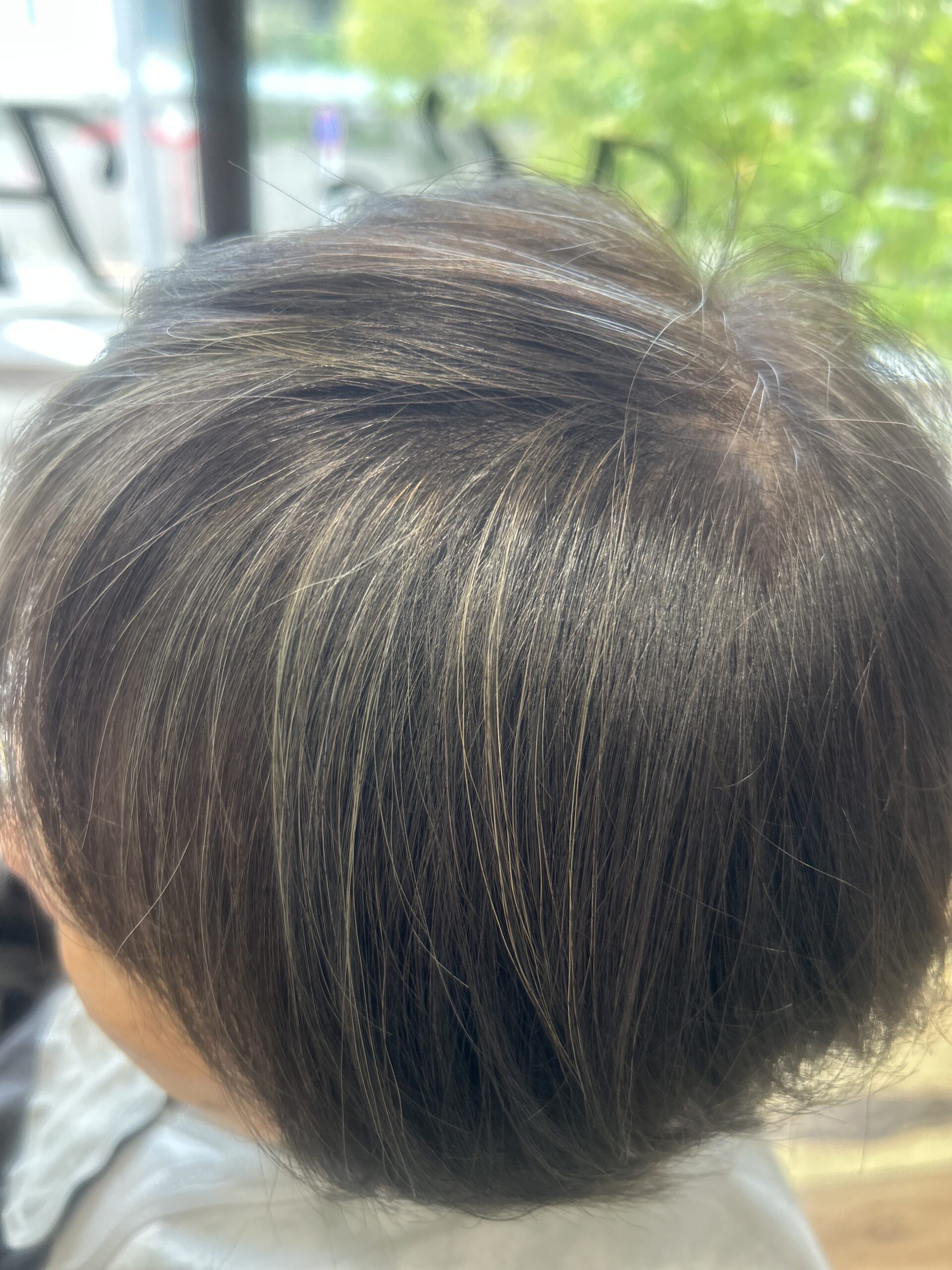 当店の白髪ぼかしハイライトは、色が抜けてきても白髪と馴染む様にしっかり入れます。